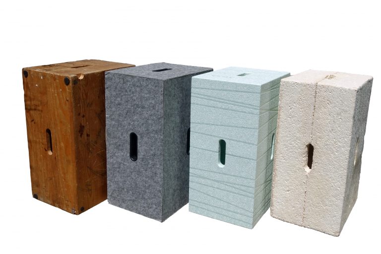 Xbrick grown bestehend aus Hanffasern und Mycelium stellt eine weitere Variante neben dem „Urahnen“ aus Holz, der Filzausführung und der aktuellen Leichtbaukonstruktion aus EPP dar, die zu 100% recycelbar ist.